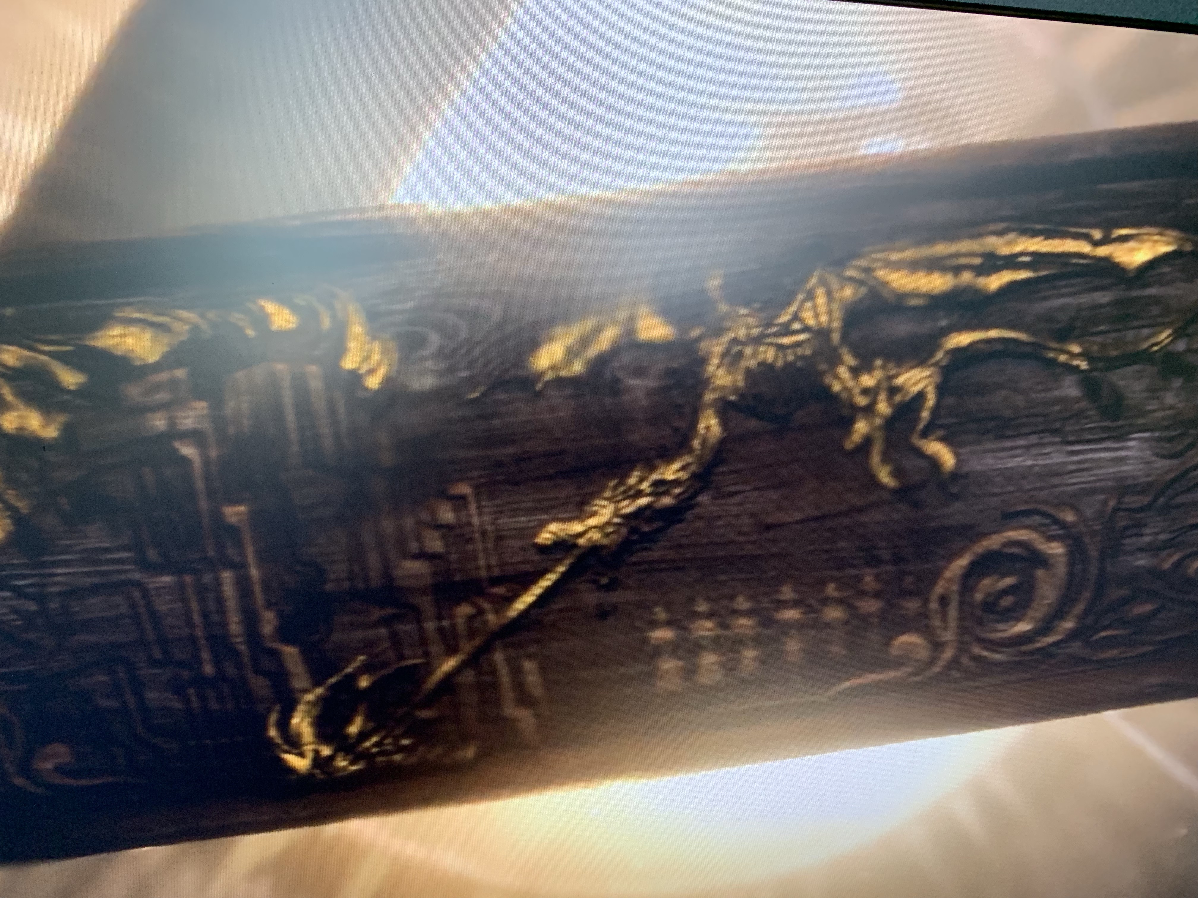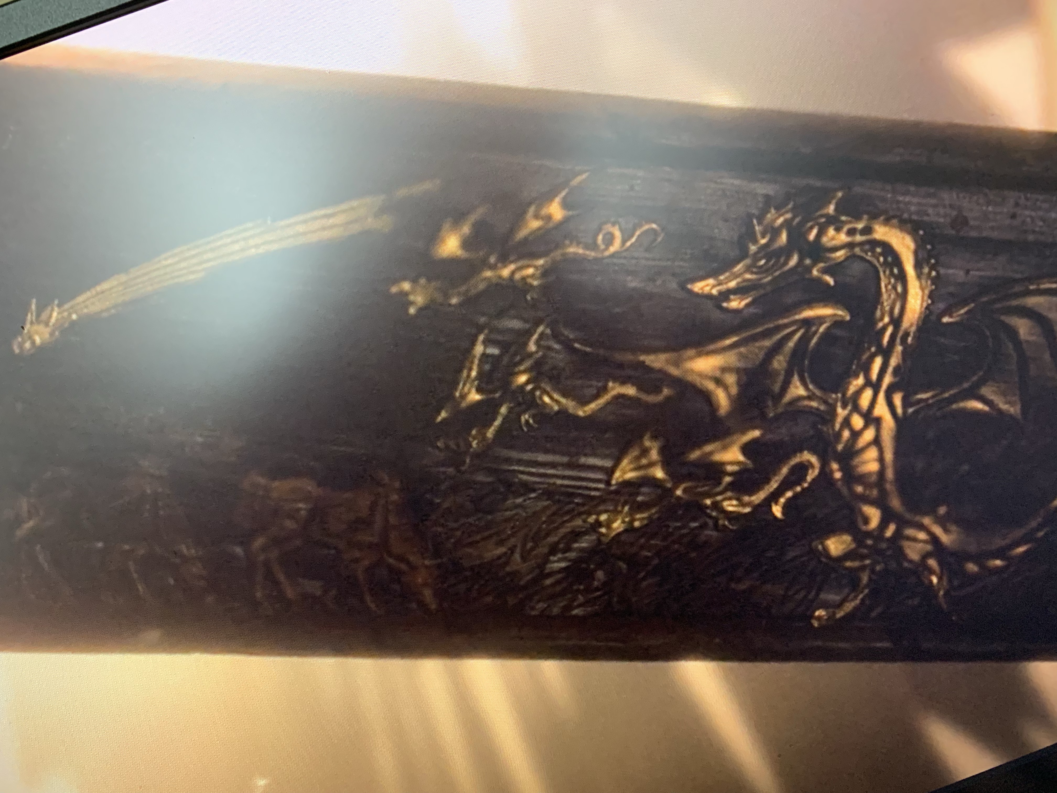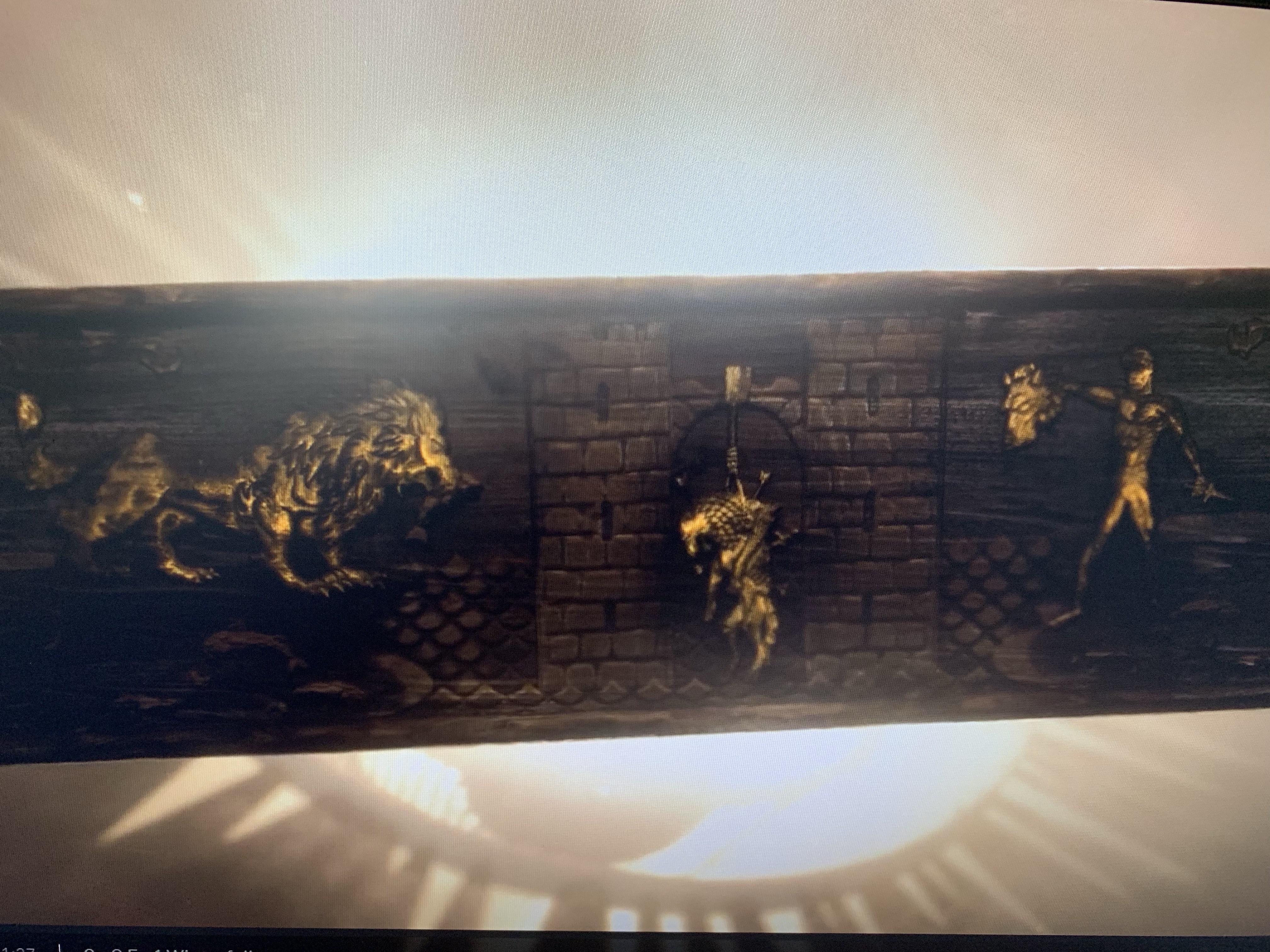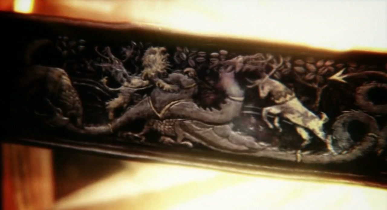 This episode had three VERY different tapestries. The first appears to be the Night King and Viserion destroying the Wall. The Dragon looks skeletal, there are lines of men just standing under it, and winds are swirling around it. The second ring is a tableau of the downfall of Houses Stark and Tully. In the dead center you see a Direwolf hanging from a noose with arrows sticking out of him in the archway between two towers – this clearly represents the Red Wedding and Robb’s death at the Twins. On the far left you see a Lion eating a Fish from the stream – Lannister has effectively destroyed House Tully with its lord and keep taken by Jaimie. On the far right, you see a man holding up the head of a Direwolf with a dagger in his hand – we’re dealing with Sigils here, and while “beheaded wolf” clearly evokes Ned Stark, the man with the knife is clearly a Flayed Man. This represents House Bolton and Ramsay’s murder of Rickon – remember, they beheaded Shaggydog. Finally, the third ring shows four dragons – one big, three small – as a comet streaks through the sky. The simplest interpretation is that this shows the rise of Dany and her three dragons – the comet was from Season 2 and was interpreted by some to mean the rise of dragons, others to mean the coming Azor Ahai or the Prince that was Promised.