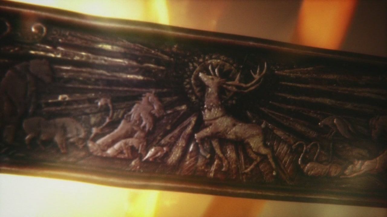 Those rings, for the past 7 seasons have shown three different tapestries. The first is the Doom of Valyria – you can see a volcano erupting and a dragon crying out in pain. This was the fiery apocalypse that destroyed the Valyrian Empire and all dragon lords (except the Targaryens – who left the Empire for Westeros years prior to the Doom). The second ring shows Robert’s Rebellion, with a Stag, a Lion, and a Direwolf attacking a Dragon – this of course symbolizes the Baratheons, Lannisters, and Starks taking down the Mad King and the Targaryen dynasty. The third ring shows a Crowned Stag standing proud, as Lion, Wolf, Falcon, Kraken, Bear, and others bow before it – Robert is King.